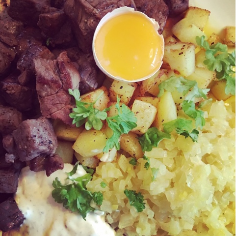 Tärna oxfilén i 1 cm stora tärningar. Koka löken mjuk med smöret i en kastrull. Hetta upp en panna, häll i olja och stek potatisen precis klar. Salta, peppa. Knäck försiktigt äggen och separera gulan från vitan. Spara en skalhalva från varje ägg och lägg gulorna i skalhalvorna. Stek köttet hastigt i olja i en het panna några minuter. Salta, peppra och lägg upp köttet på ena sidan av ett stort fat. Lägg potatisen på andra sidan, löken i mitten och äggulorna i sina skal uppe på. Strö persiljan över löken. Blanda senap och créme fraiche i en skål. Smaka av med salt och servera vid sidan om.